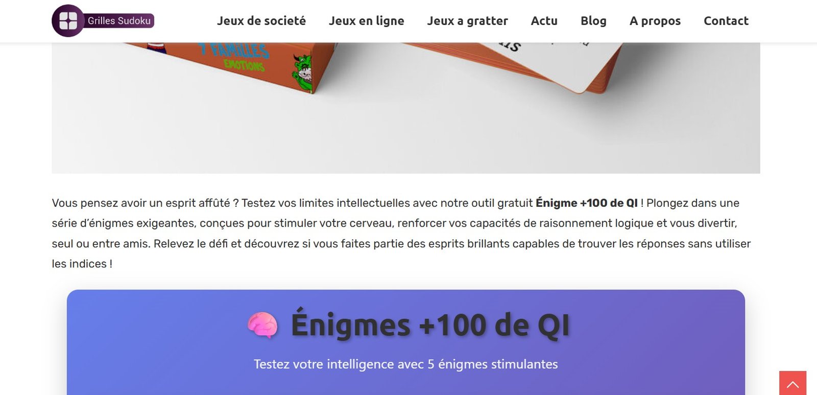 Intégré au site grilles-sudoku.net, l’énigme +100 de QI est un outil de réflexion en ligne conçu pour mettre à l’épreuve les capacités cognitives avancées des joueurs. Comme son appellation l’indique, il s’agit d’une énigme qui, si le joueur parvient à la résoudre, promet d’augmenter le QI de ce dernier de 100. Contrairement aux jeux classiques, elle repose sur des énigmes exigeantes, demandant une mobilisation simultanée de plusieurs compétences intellectuelles. Chaque problème sollicite une logique pure, la mémoire de travail et la capacité à établir des liens abstraits entre différentes informations.